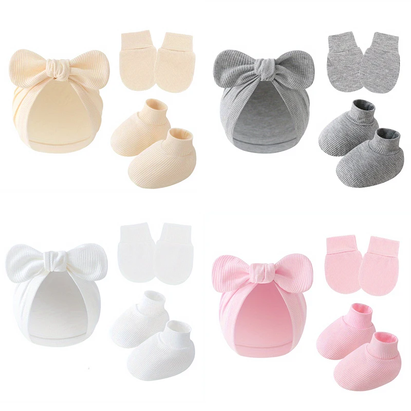 3 pièces/ensemble bébé nœud chapeau gants chaussettes coton nouveau-né Bonnet couleur unie Bonnet pour filles garçons infantile douche cadeaux 0-6M — Meilleur prix 2026