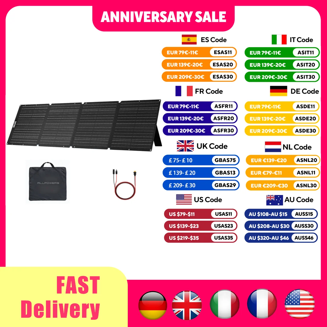 Le ALLPOWERS SE200 200W panneau solaire monocristallin ETFE IP68 panneau solaire pliable étanche pour générateur solaire extérieur RV voyage est disponible chez plusieurs marchands français de confiance. Vérifiez toujours la disponibilité en stock et les délais de livraison avant de finaliser votre commande pour éviter les mauvaises surprises. Sur Compiral, les offres affichant "En stock" peuvent être livrées rapidement, souvent sous 2 à 5 jours ouvrés selon le marchand et votre adresse de livraison en France métropolitaine.