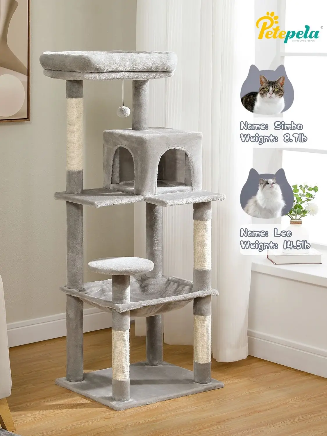 Questions fréquentes sur Arbre à chat pour chats d'intérieur, tour à chat à 5 niveaux pour grands chats avec grand hamac, poteaux à gratter couverts en Sisal, perche supérieure confortable pour Condo