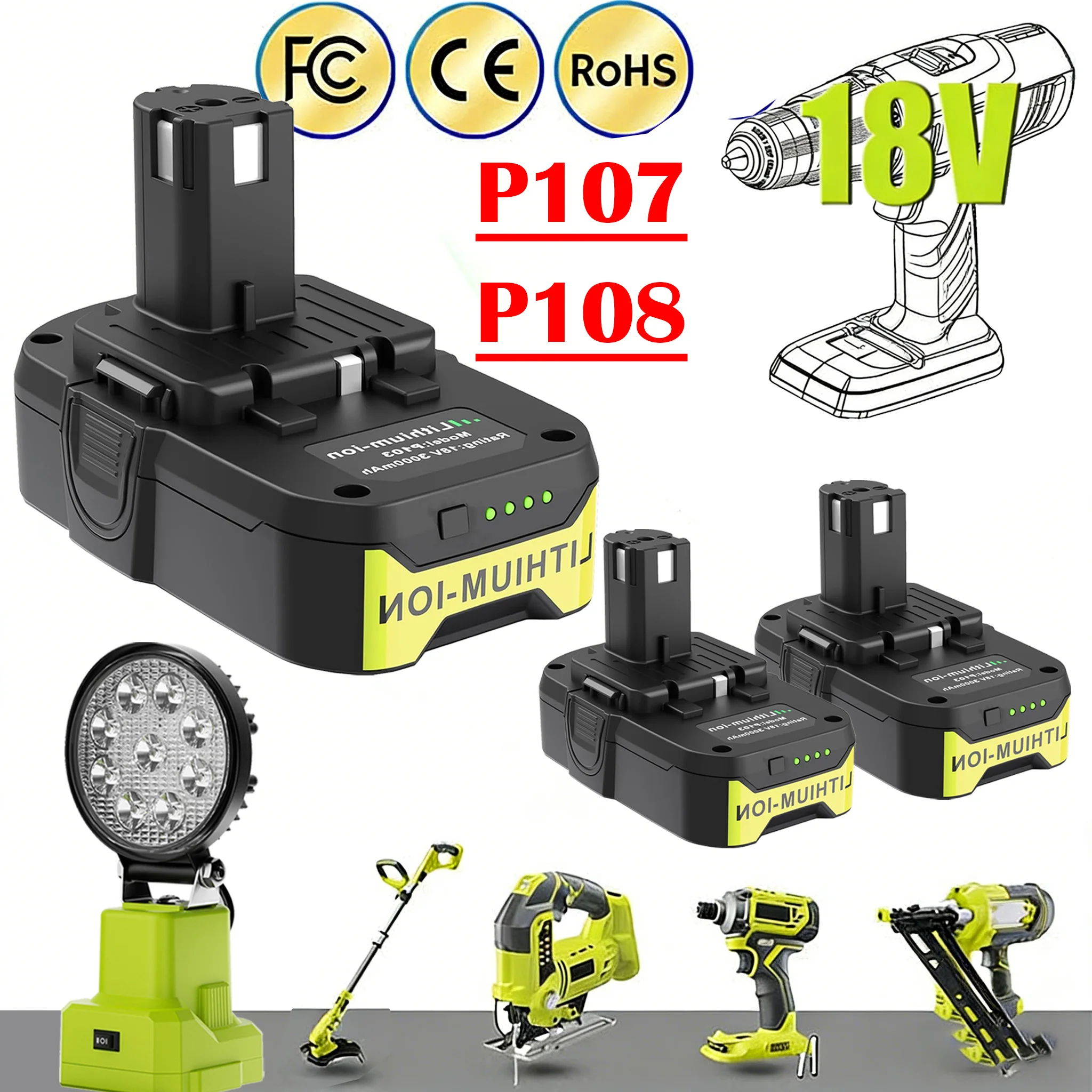 Batterie de remplacement 3000mAh P107 pour outils Ryobi 18V P100 P103 P104 P105 P108 P109 P190, batterie Li-ion Rechargeable sans fil
