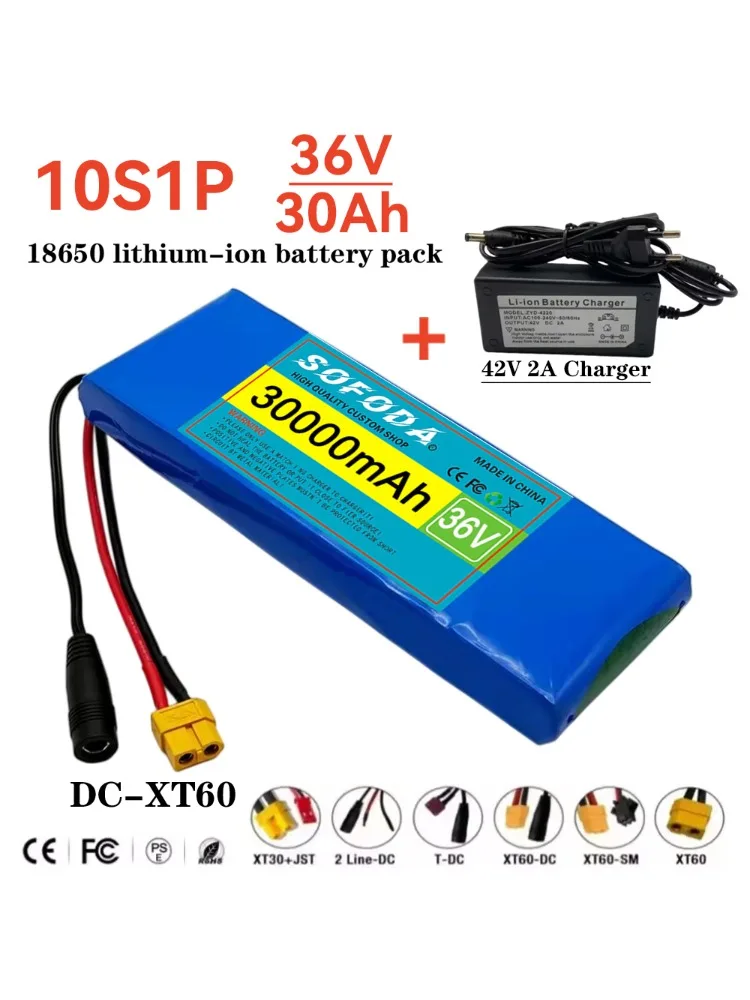 Batterie rechargeable lithium-ion 36V 30000mAh 10S1P 18650 30Ah, avec BMS 500W, équipée d'un chargeur 42V 2A