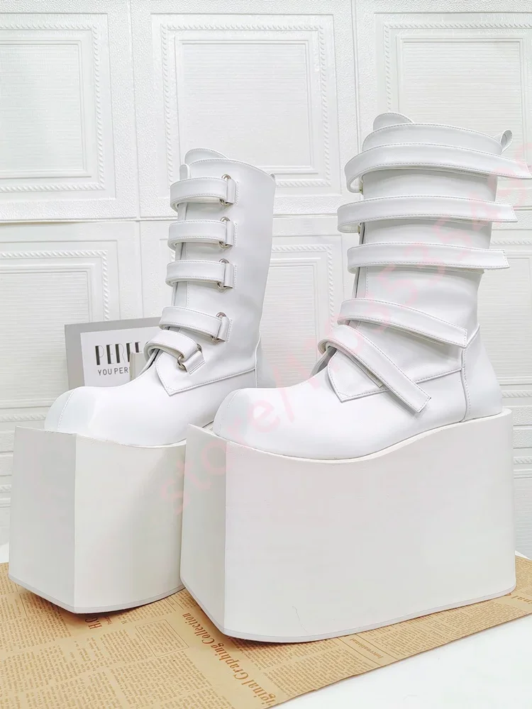 Bottes plateforme mi-mollet carrées style punk, hiver, à scratchs, talon compensé rehaussant la taille, pour mode, soirée, décontracté et scène