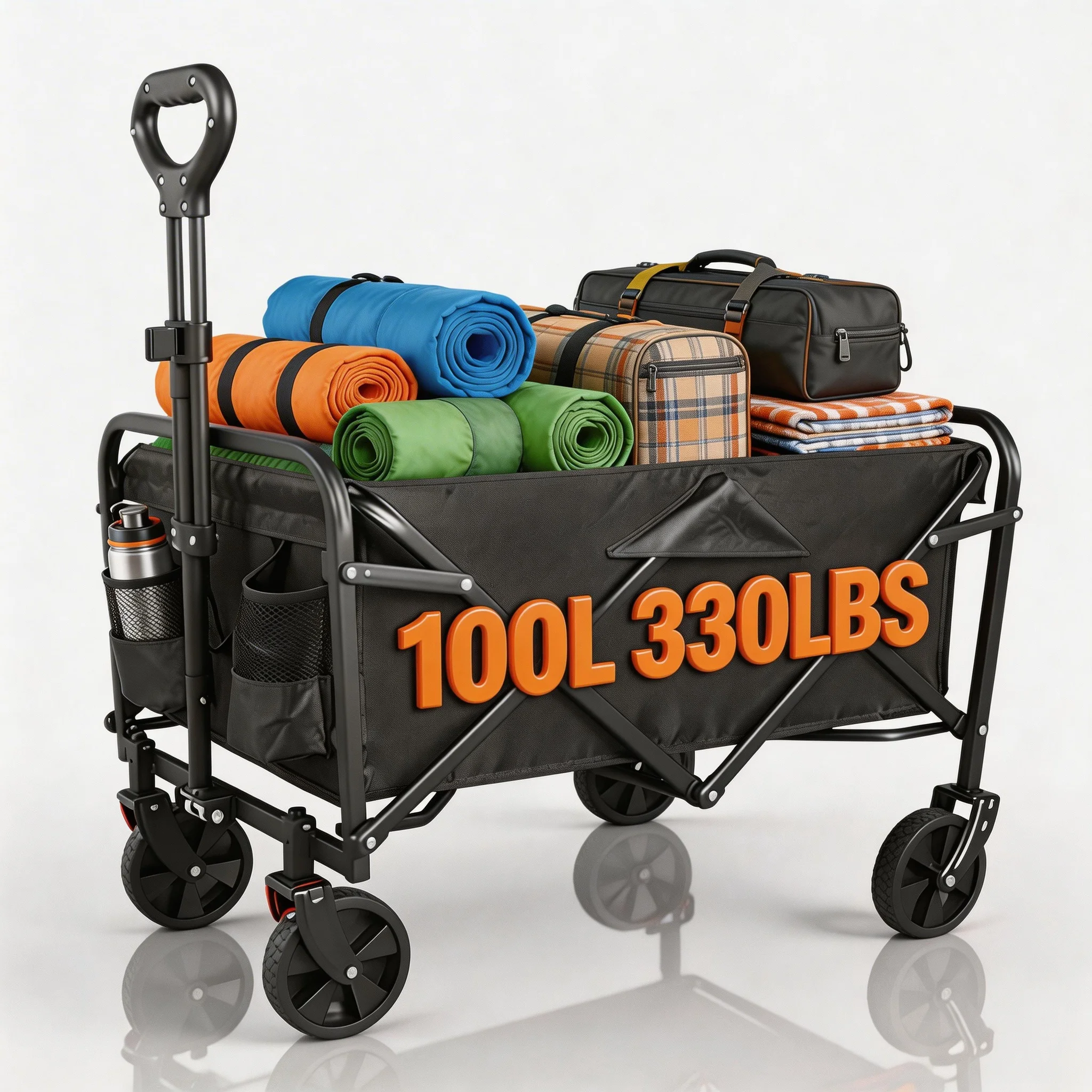 Chariot de camping pliable robuste et grande capacité avec porte-gobelets