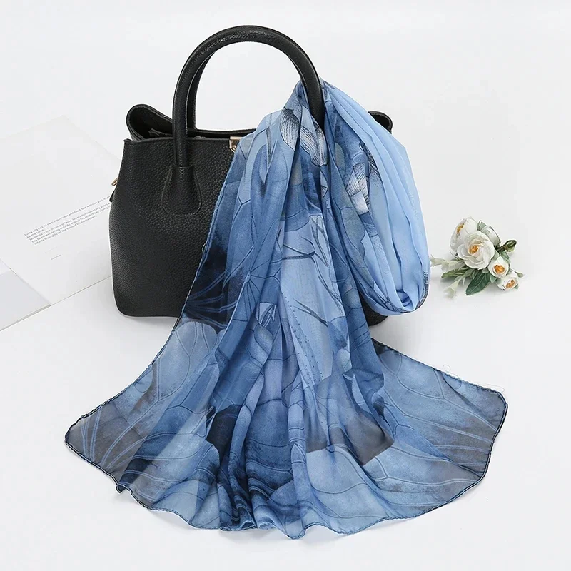 Écharpe en mousseline de soie imprimé Lotus, écharpe légère à la mode pour femmes, Protection solaire du cou d'été, châle en soie 150x50cm
