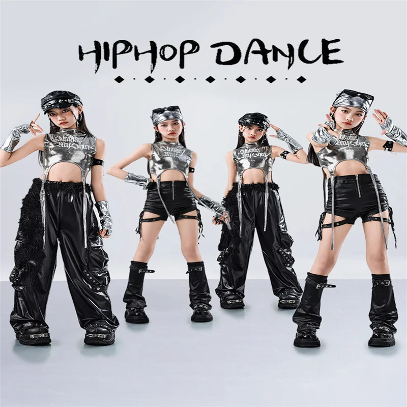 Ensemble Hip Hop pour filles, K-pop, Riband argenté, haut court, pantalon en cuir, danse de rue, Streetwear pour enfants, Costume de Jazz, vêtements de groupe pour filles