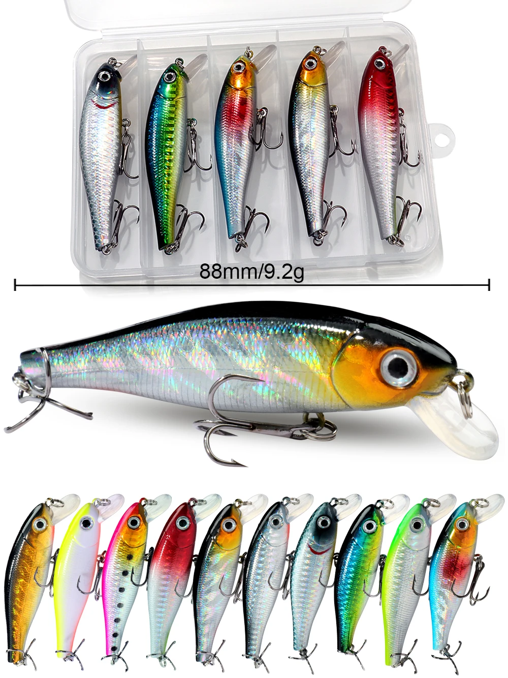 Analyse technique du Kit de leurre de pêche, coffret de méné flottant, 9.2g, 8.8cm, appâts Wobbler, crochet de pêche à la carpe, hochet, manivelle, 2/3/5/10 pièces, Jerkbait