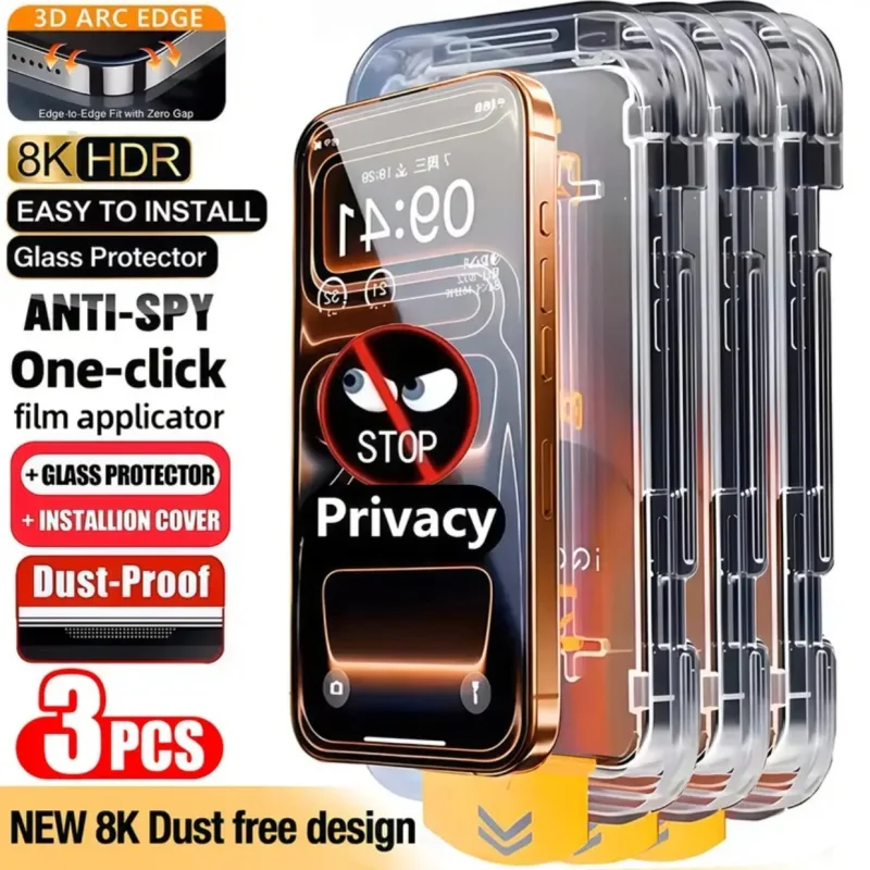Questions fréquentes sur Lot de 3 films de protection d'écran anti-espion avec revêtement oléophobe pour iPhone 17 Pro Max 16 15 13 11 14 12 Air 16E Mini, installation sans poussière