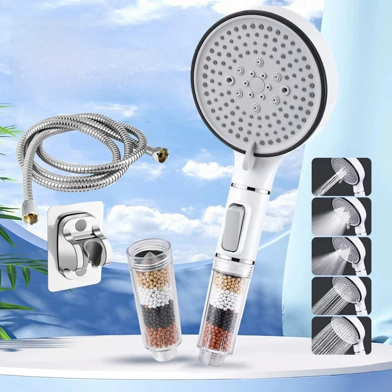 Acheter le Pommeau de douche de salle de bain avec bouton d'arrêt, 5 modes, filtre anti-calaire, hygiénique, élimine le chlore, pomme de douche à main, Filtration maintenant ou attendre ?
