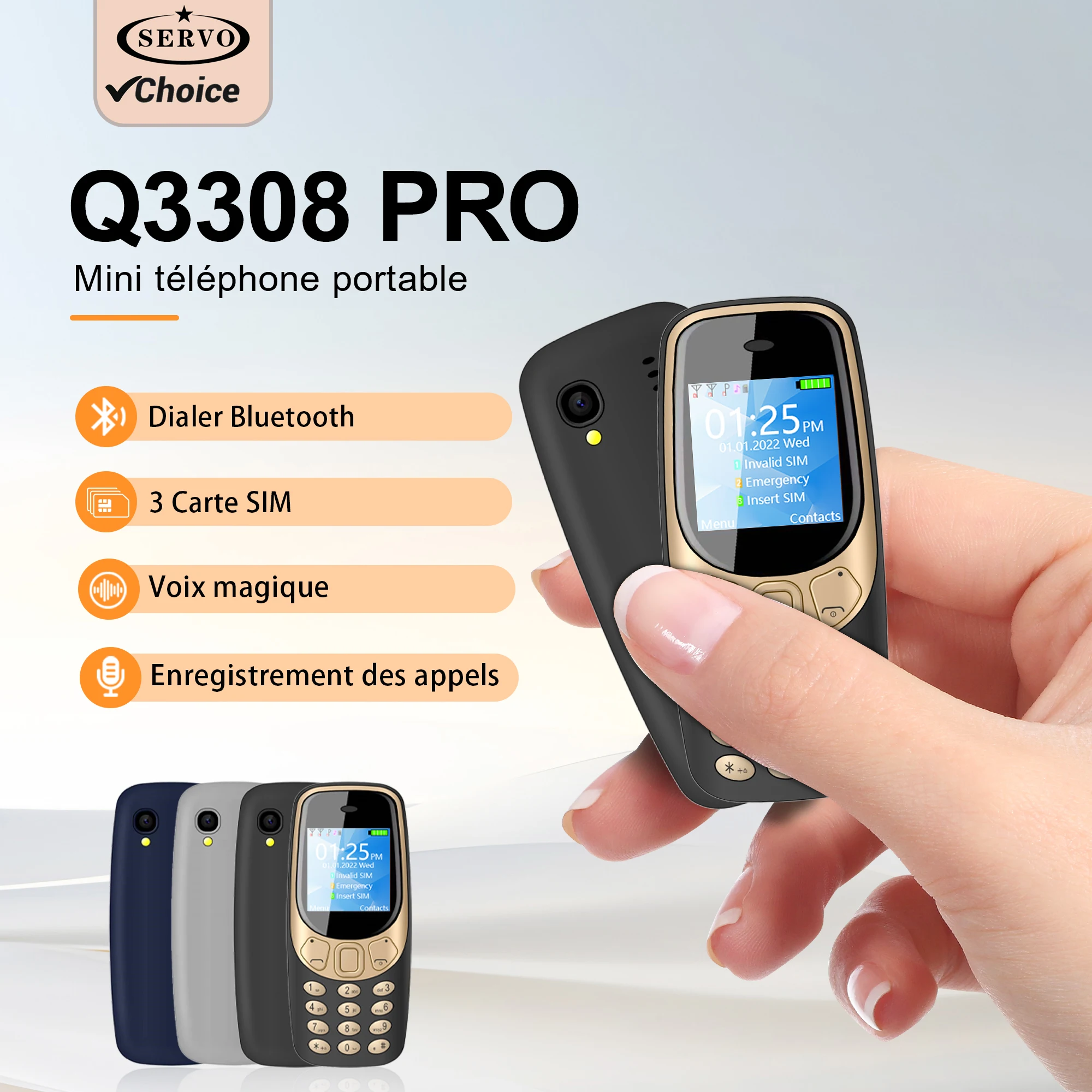 Questions fréquentes sur Téléphone portable mini portable SERVO, 3 cartes SIM, 3 en veille, Bluetooth, appel vocal, enregistrement d'appels, voix magique, radio FM, lampe torche