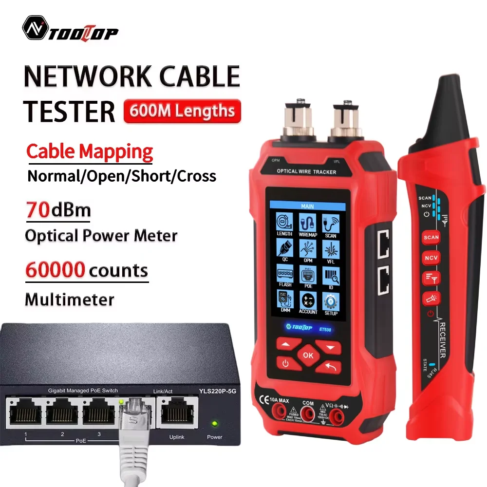 TOOLTOP ET638 testeur de câble réseau 60000 points multimètre compteur de puissance optique Test POE testeur de réseau Lan avec 7 pièces ID à distance — Meilleur prix 2026