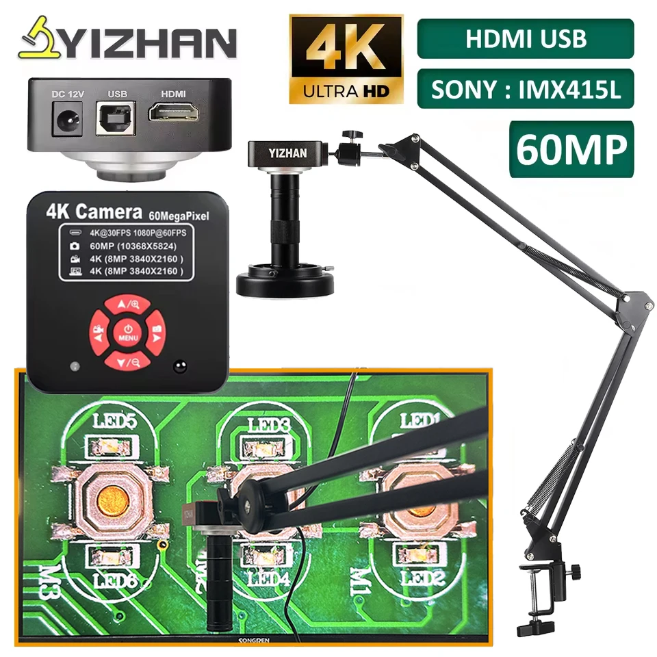 YIZHAN 4K 60MP Microscope numérique 1080P HDMI USB Microscope vidéo 1-150X C monture lentille bras articulé pour réparation soudure