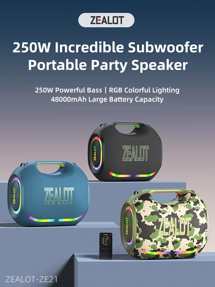 ZEALOT-ZE21 250W haut-parleur Bluetooth Portable haut Volume étanche 48000mAh sans fil TWS caisson de basses Suporrt USB/TF/AUX lumière RGB : analyse technique complète en 2026